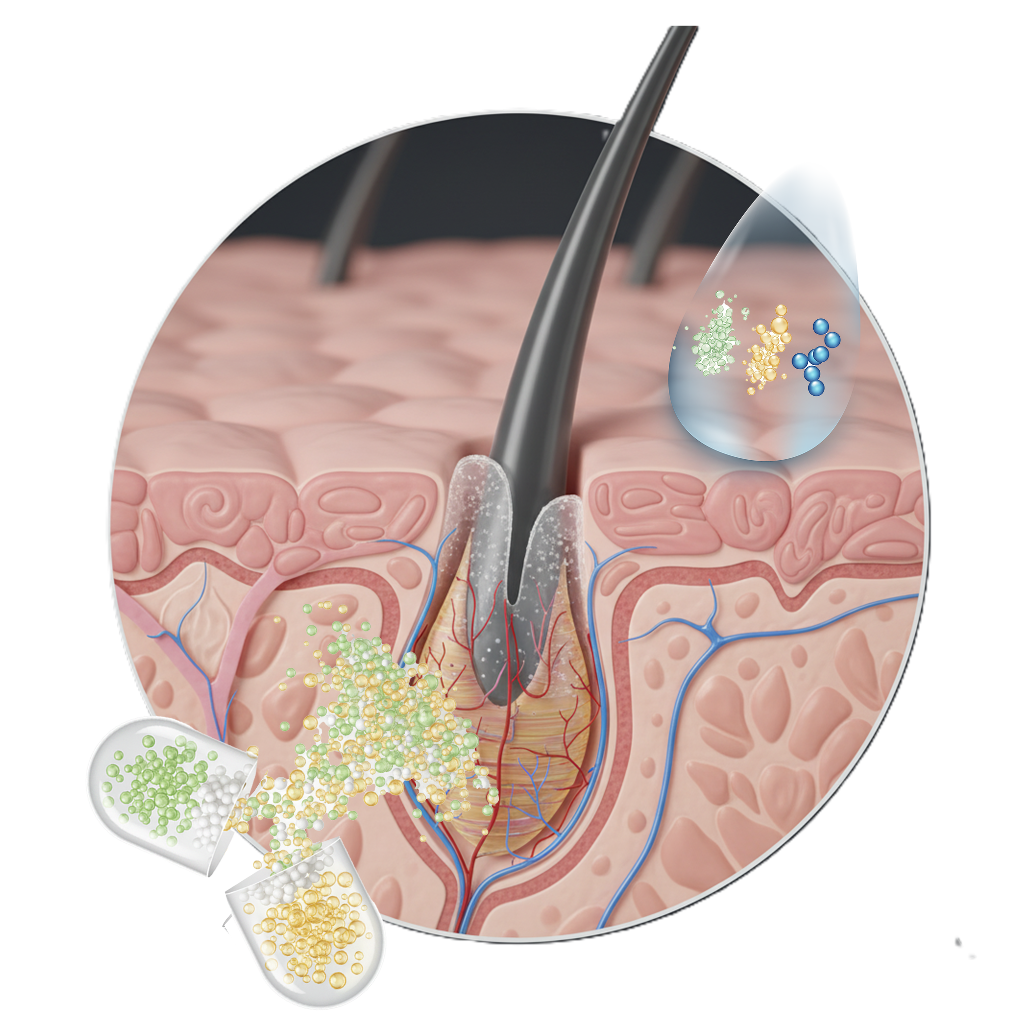 Stress, hormones and time weaken your hair at the root cells, the growth engine. Most solutions only treat the surface or surroundings.